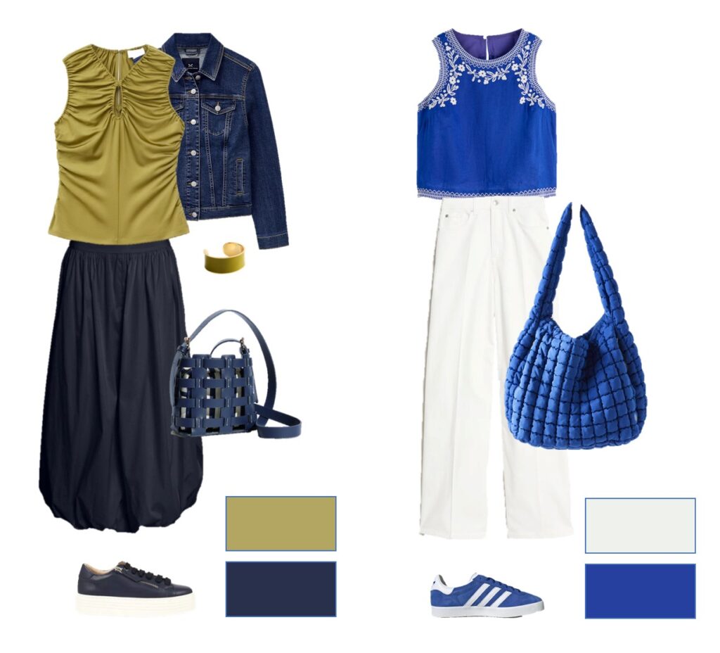 If you have COOL colouring, then blues are made for you! In the second outfit here I’ve created a bright cobalt blue and white outfit perfect for warm days. (The top is from Boden, the white jeans and bag are from M&S and the trainers are from Adidas).